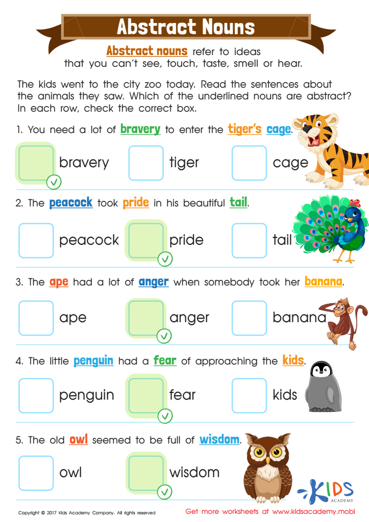 Our abstract noun worksheet is designed to make learning fun and interactive. Students will be challenged to identify abstract nouns in sentences, match abstract nouns to their corresponding concrete nouns, and even create their own sentences using abstract nouns.