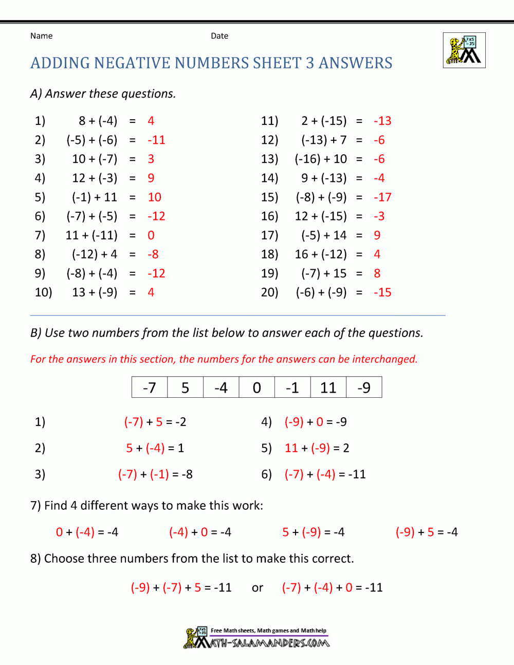 Adding Integers Worksheet