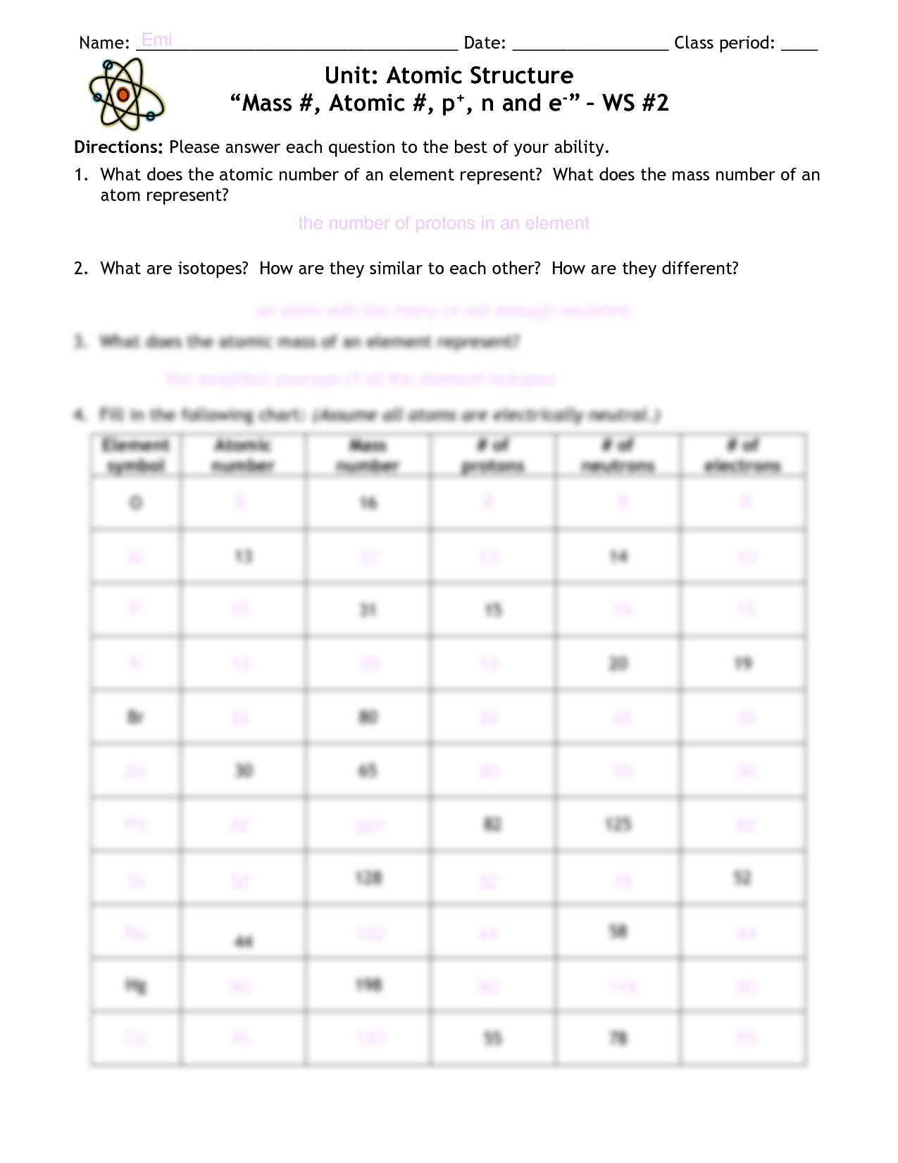 Atomic Structure Worksheet Answers