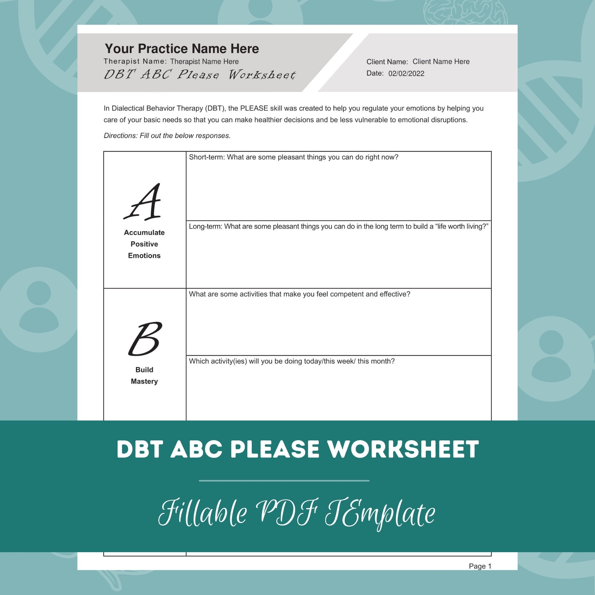 Dialectical Behavior Therapy (DBT) is a type of cognitive-behavioral therapy that focuses on the psychosocial aspects of therapy. DBT is often used to treat individuals with borderline personality disorder, as well as other mental health conditions. One of the key components of DBT is the use of worksheets to help individuals develop skills to manage their emotions, improve relationships, and cope with distressing situations.