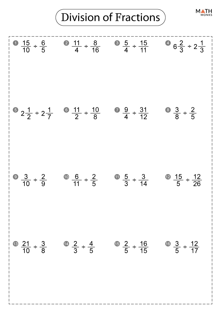 Dividing fractions can be a challenging concept for students to grasp. One effective way to help them understand this concept is through the use of dividing fractions worksheets. These worksheets provide students with the opportunity to practice dividing fractions in a structured and guided manner, allowing them to build their skills and confidence in this area.