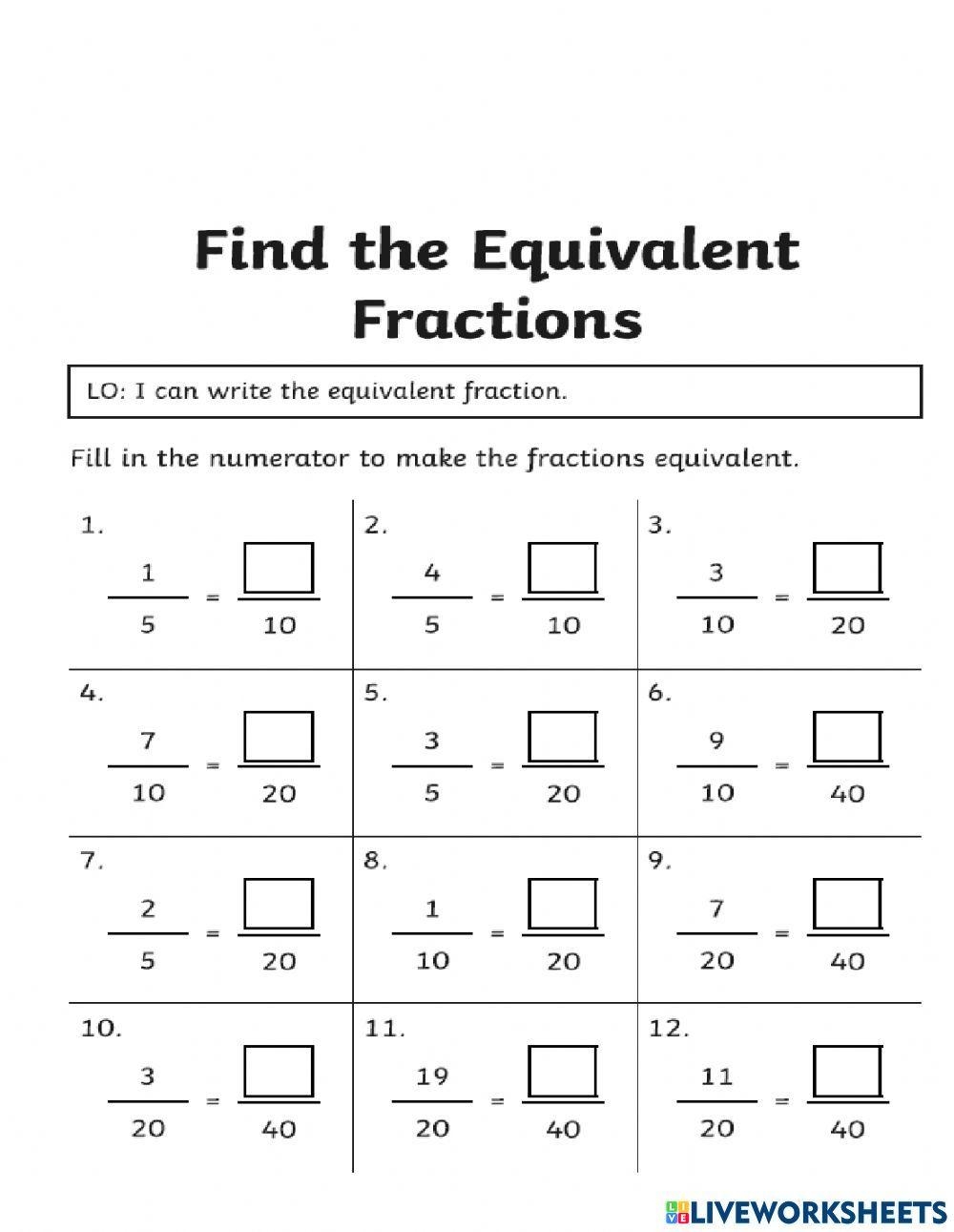 By practicing with equivalent fractions worksheets, students can improve their skills in working with fractions, develop a deeper understanding of how fractions work, and build their confidence in solving fraction problems. These worksheets can be used in the classroom as part of a lesson or as homework assignments to reinforce learning outside of school.