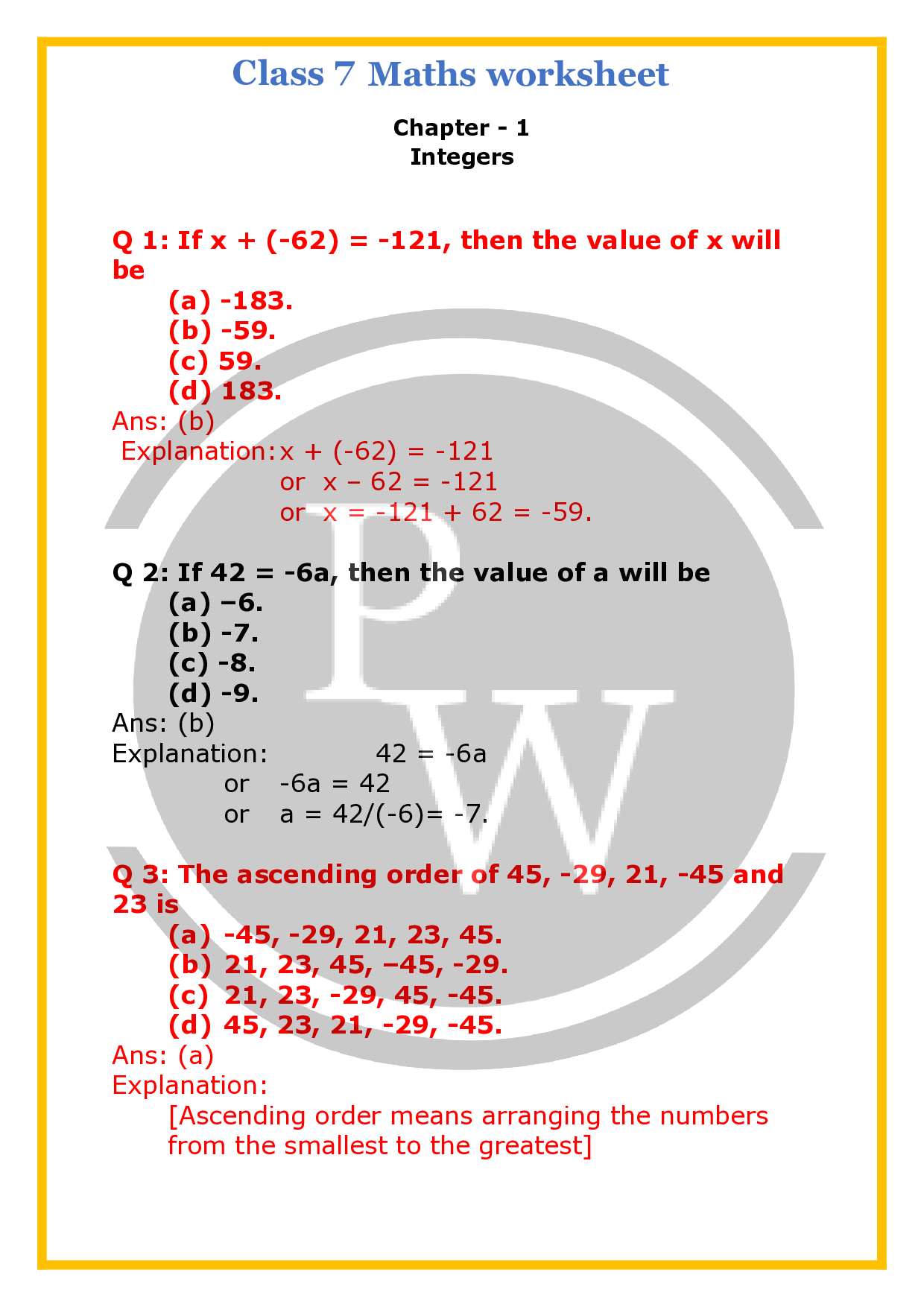CBSE Worksheet For Class 7 Maths Chapter 1 Integers PWCBSE Worksheet For Class 7 Maths Chapter 1 Integers PW