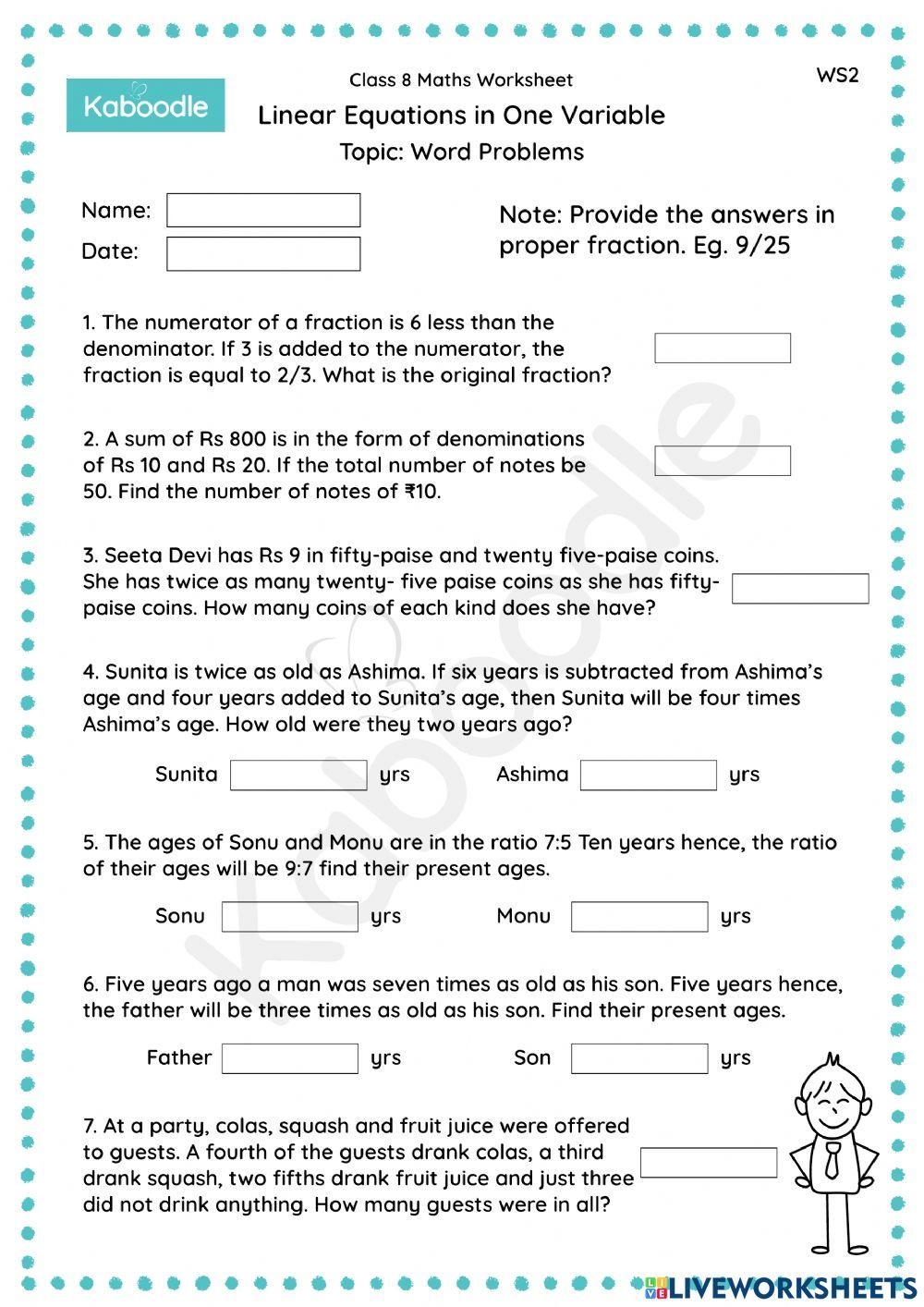 Linear Equation Word Problems Worksheet Grade 7 Linear Equations In One Linear Equation Word Problems Worksheet Grade 7 Linear Equations In One