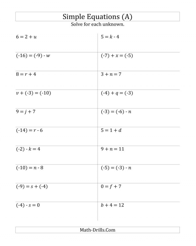 One step equations worksheets can vary in difficulty, with some featuring more complex equations or requiring students to apply multiple steps to solve. These worksheets can be used in the classroom as part of a lesson or as homework assignments for students to practice their skills independently.