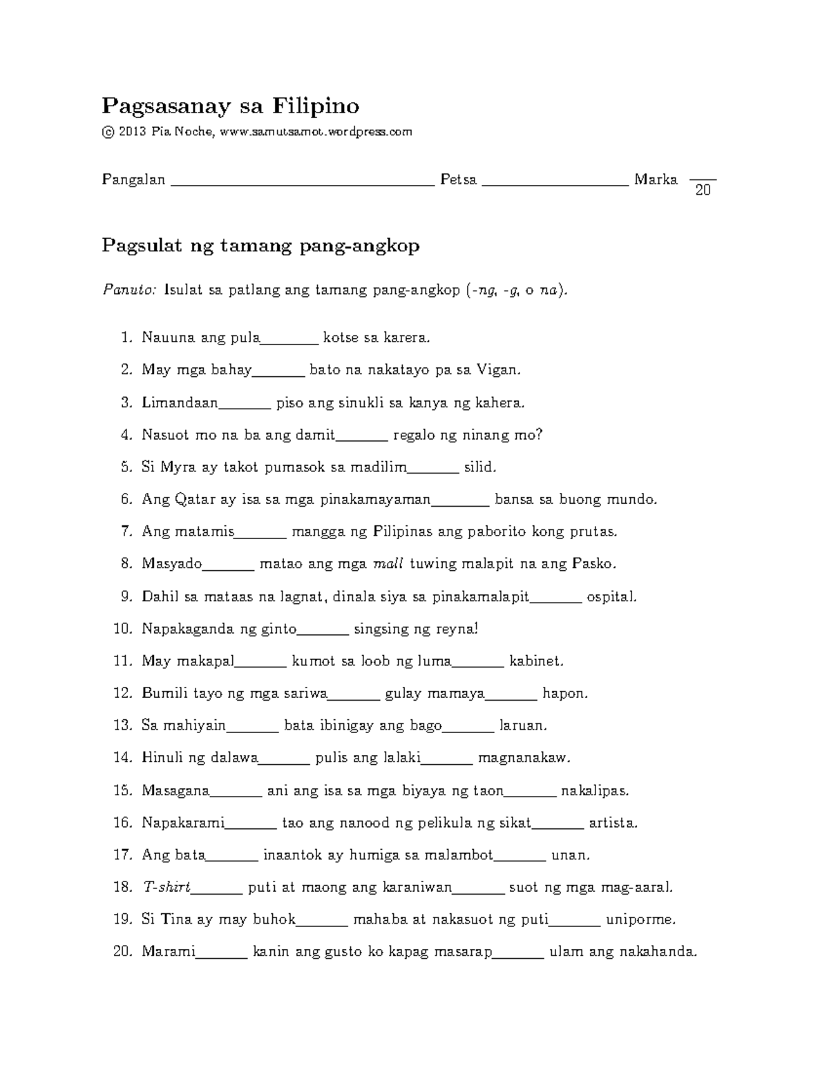 Pang-Ugnay Worksheet