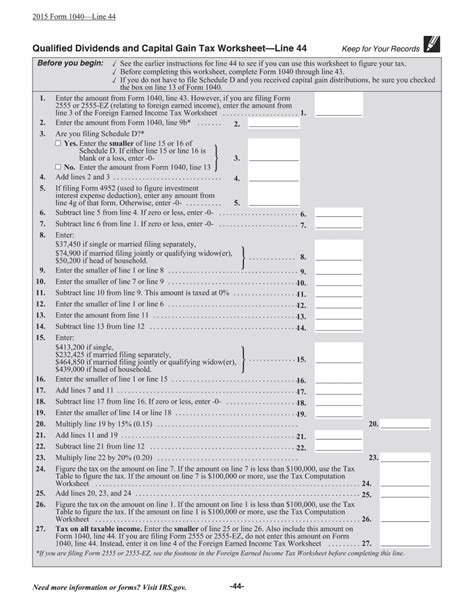 The worksheet takes into account your filing status, taxable income, and the type and amount of investment income you have received. By following the instructions on the worksheet, you can calculate the tax owed on your qualified dividends and capital gains and ensure that you are paying the correct amount of tax to the IRS.