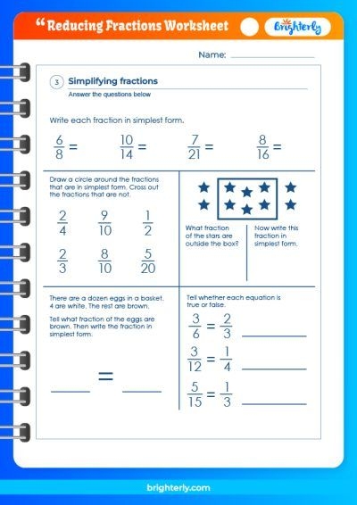 These worksheets typically contain a series of fraction problems that students need to simplify by reducing them to their simplest form. By completing these exercises, students can improve their understanding of fractions and develop their problem-solving skills.