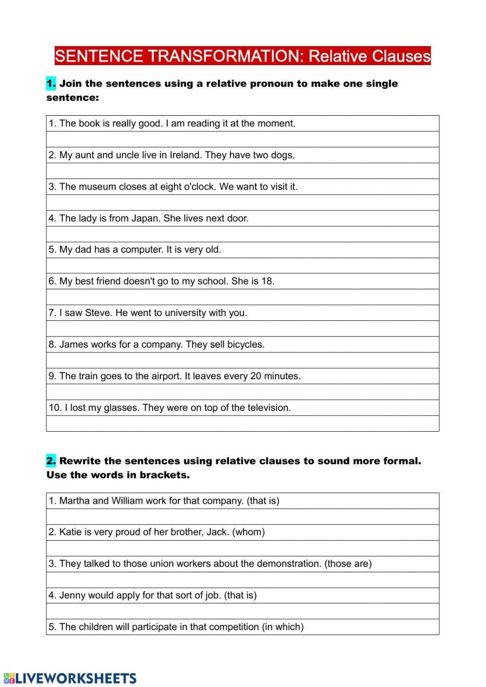 Sentence Transformation Relative Clauses Worksheet Sentenceworksheets