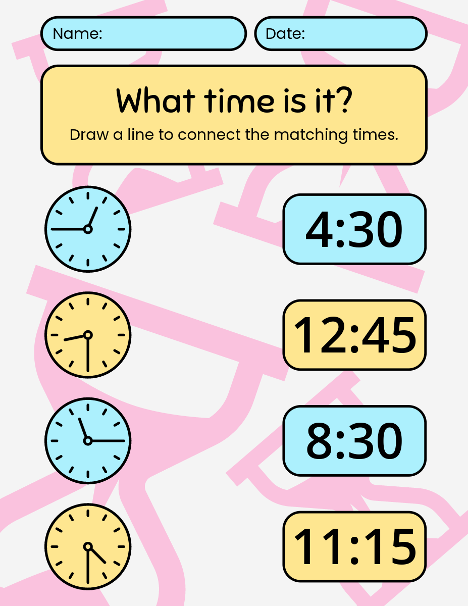Next, provide children with worksheets that focus on specific time intervals such as telling time to the hour, half-hour, quarter-hour, and minute. Encourage them to practice reading and writing different times using both analog and digital formats. This will help reinforce their understanding of time and enhance their time-telling skills.